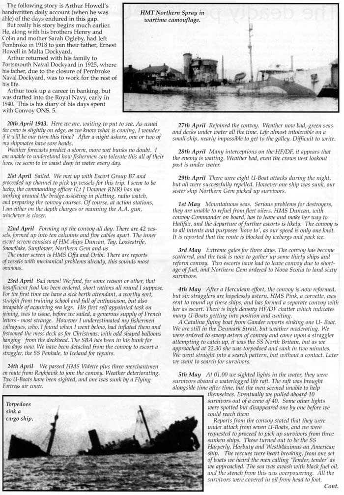 A convoy assembles during WW2 Two ships, Mckeesport and Dolius ( British ) had initially sailed with Convoy SC 122, and had survived the onslought by U-Boats over the 17th./20th. of March. Most of the Convoy were in ballast, all had sailed before in convoys and knew what was required of them in terms of station keeping, and what they might expect when the U-Boats attacked, as they always did on these journeys across the Atlantic, no matter whether one was East or West bound. The empty ships were bound for both North and South American ports to load food, fuel, armaments, raw materials, for the long flog back to Britain, these convoys were the life line that sustained the English people during the war, and allowed England to build up the sinews of war required for the future invasion of fortress Europe. By the 2nd. of April, the Commodore had assembled his flock, 1,000 yards between columns, and 800 yards between ships in the individual columns. over all this convoy with its Escort was spread over 8.75 nautical miles. Commander Peter Gretton, Royal Navy was the Senior Officer of this B7 Escort Group. The leader's ship was the destroyer HMS Duncan, the 5th. ship to carry that name, launched in July 1932, to be completed by the end of March 1933, and converted to an anti/submarine Escort at Chatham, then to join Western Approaches Escort Group B7 in April of 1943. She was fitted with ahead throwing Hedge Hog, High Frequency/ Direction Finding equipment, and Type 271 Radar. Frigate HMS Tay, Corvettes HMS Loosestrife, HMS Pink, and HMS Snowflake, two Rescue Trawlers, Northern Gem and Northern Spray, plus a Tanker, British Lady, made up the Escort. A second destroyer HMS Vidette, commanded by Lieutenant Raymond S. Hart Royal Navy, had gone ahead to collect two freighters, and a USN Tanker from Iceland, and they were all to rendezvous mid ocean. Hart was the only other Royal Naval Officer in command besides Commander Gretton, all other ship Captains were Reserve Officers from Australia, Canada and New Zealand. Gretton had been the First Lieutenant in HMS Cossack at the Second Battle of Narvic, he had trained as a pilot, and had also completed an anti - submarine course at HMS Osprey ( the anti - submarine training school at Portland in Dorset, where I spent six months in 1946 during my specialist course as a Torpedo Anti - Submarine Officer. )